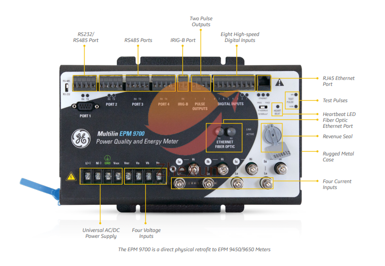جهاز القياس EPM 9700 مزود بإمكانيات اتصال واسعة تُمكّنه من التواصل مع العديد من أنظمة SCADA أو أنظمة الاتصالات الأخرى في آنٍ واحد. يحتوي الجهاز على 6 منافذ اتصال قياسية، منها 4 منافذ تسلسلية ومنفذا اتصال إيثرنت. تتضمن منافذ الإيثرنت منفذ ألياف بصرية بنهاية ST ومنفذ RJ45. يستخدم كلا المنفذين عنواني IP منفصلين، مما يسمح بتشغيلهما على شبكات احتياطية متزامنة.